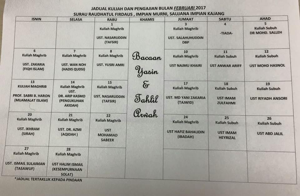 Surau Raudhatul Firdaus Aktiviti Minggu Ke 3 Bulan Februari 2017
